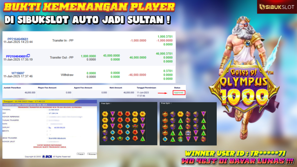 Bukti Kemenangan 11 Juni 2025 Di Game Gates of Olympus 1000 WD 46 Juta