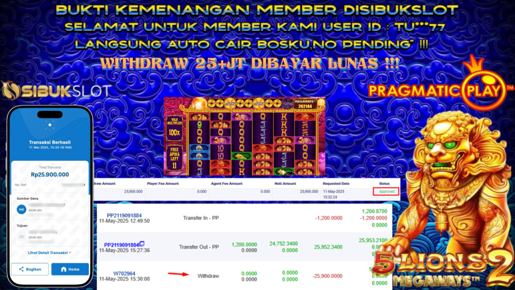 Bukti Kemenangan 11 Mei 2025 Di Game 5 Lions Megaways ™ 2 WD 25.9 Juta