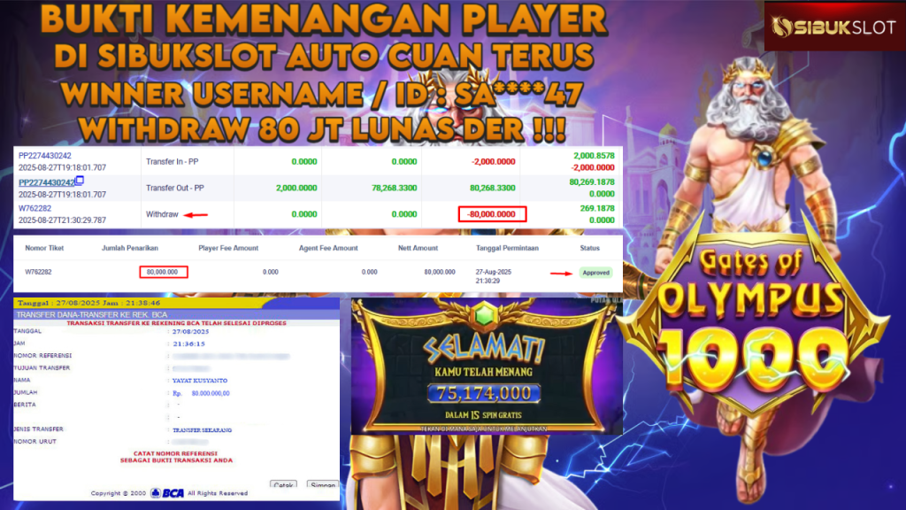 Bukti Kemenangan 27 Agustus 2025 Di Game Gates of Olympus 1000 WD 80 Juta