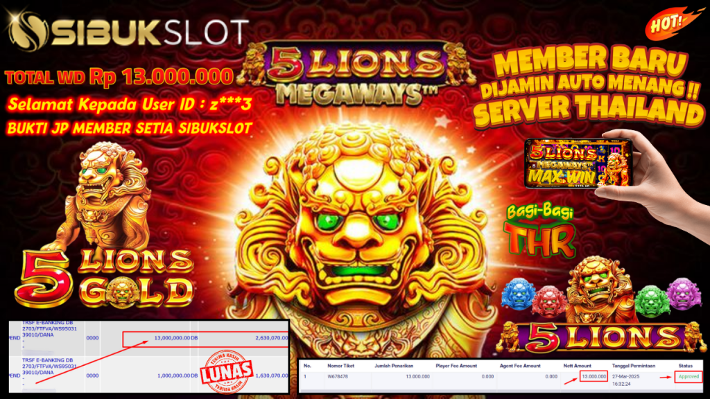 Bukti Kemenangan 27 Maret 2025 Di Game 5 Lion Megaways WD 13 Juta
