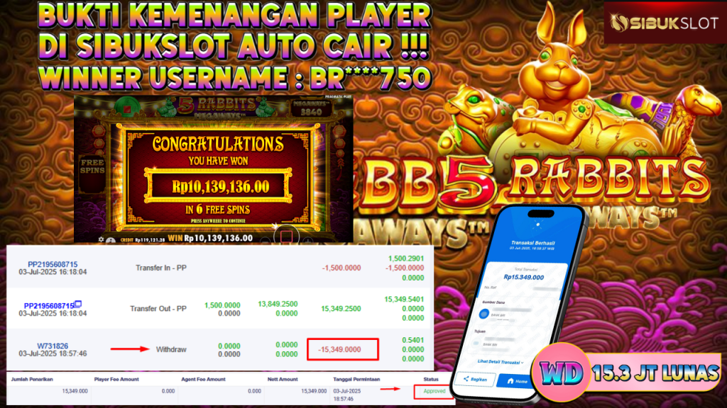 Bukti Kemenangan 3 Juli 2025 Di Game 5 Rabbits Megaways WD 15.3 Juta