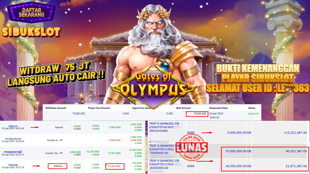 Bukti Kemenangan 3 Maret 2025 Di Game Gate Of Olympus 1000 WD 75 Juta